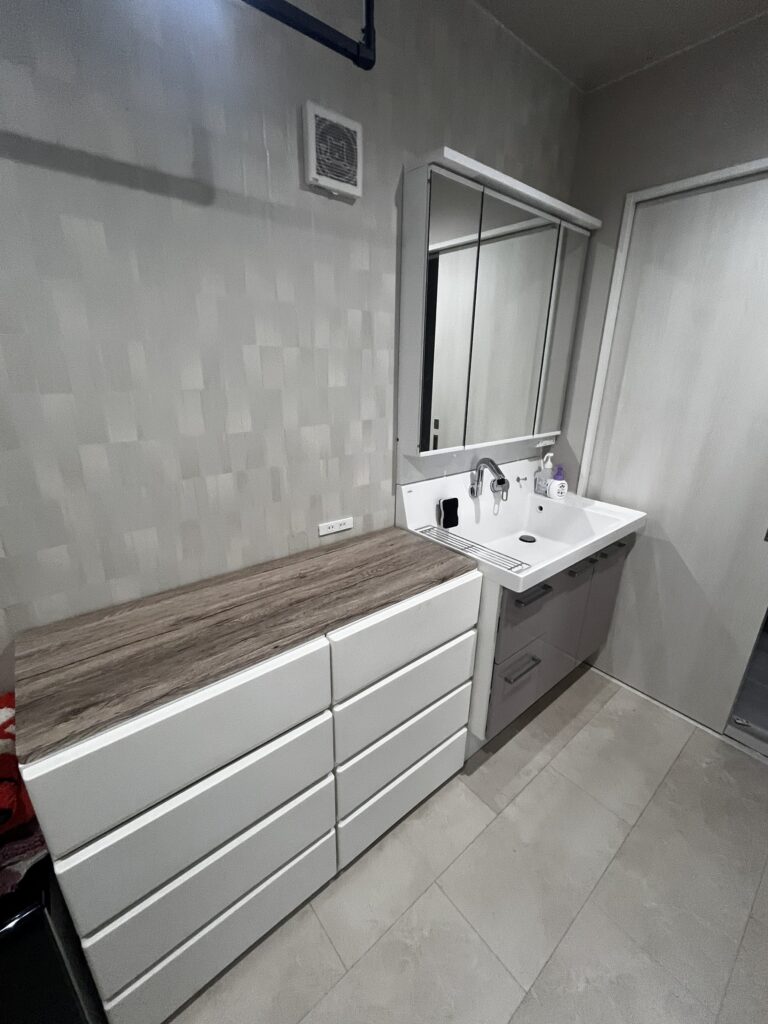 けれど30坪という限られた面積では幅が足りず、収納とのバランスも取れません。最終的には標準の洗面台を採用し、その代わりに周囲をタイルやアクセントクロスでデザイン。小さな妥協の中にも、自分たちなりの工夫を込めました。