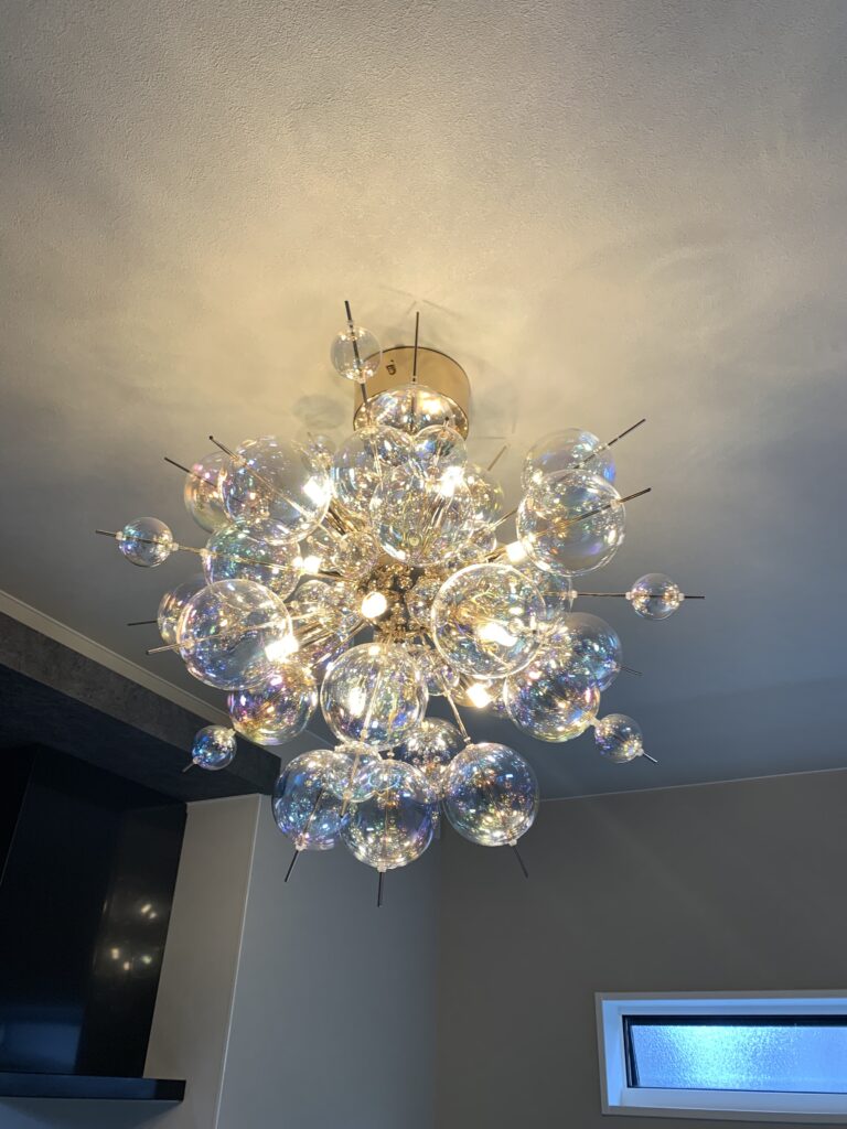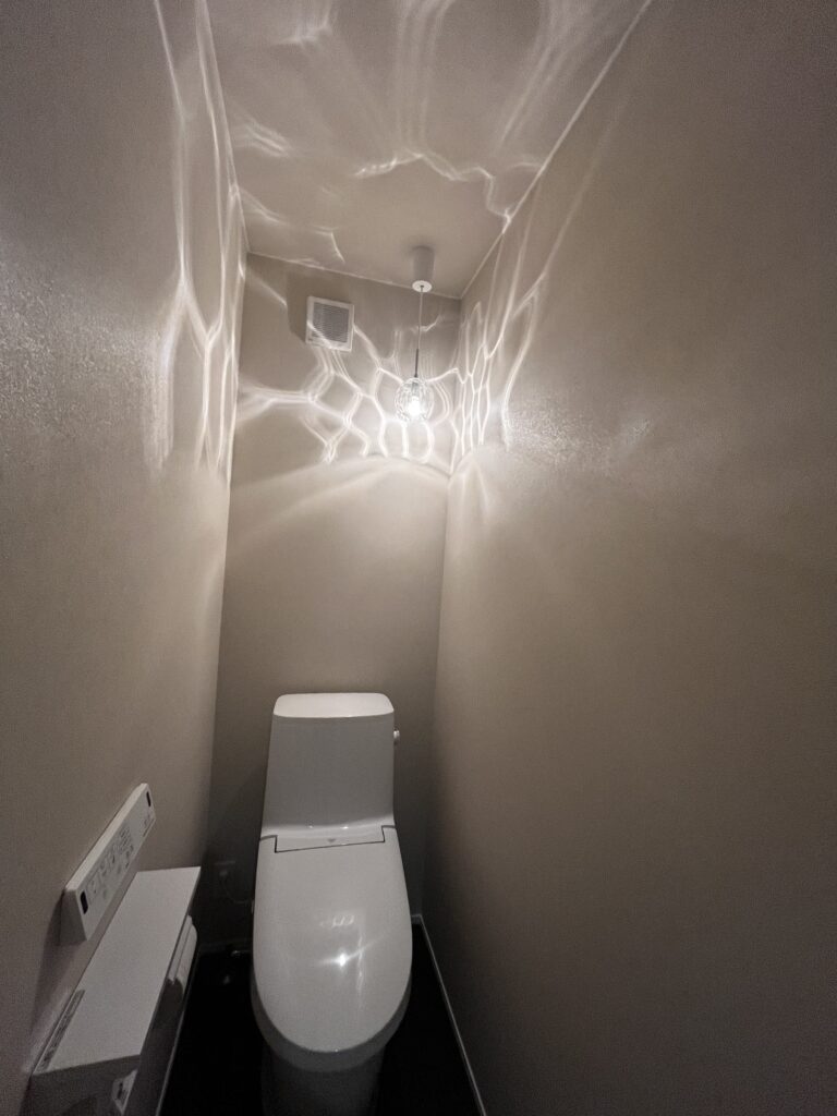標準の位置に照明を付けると、ただ「明るいだけ」になってしまうのが嫌で、あえて位置をずらしました。そこに選んだのは、アクア風の照明。水のゆらめきを感じるような柔らかい光が、小さな空間を少しだけ特別なものにしてくれます。